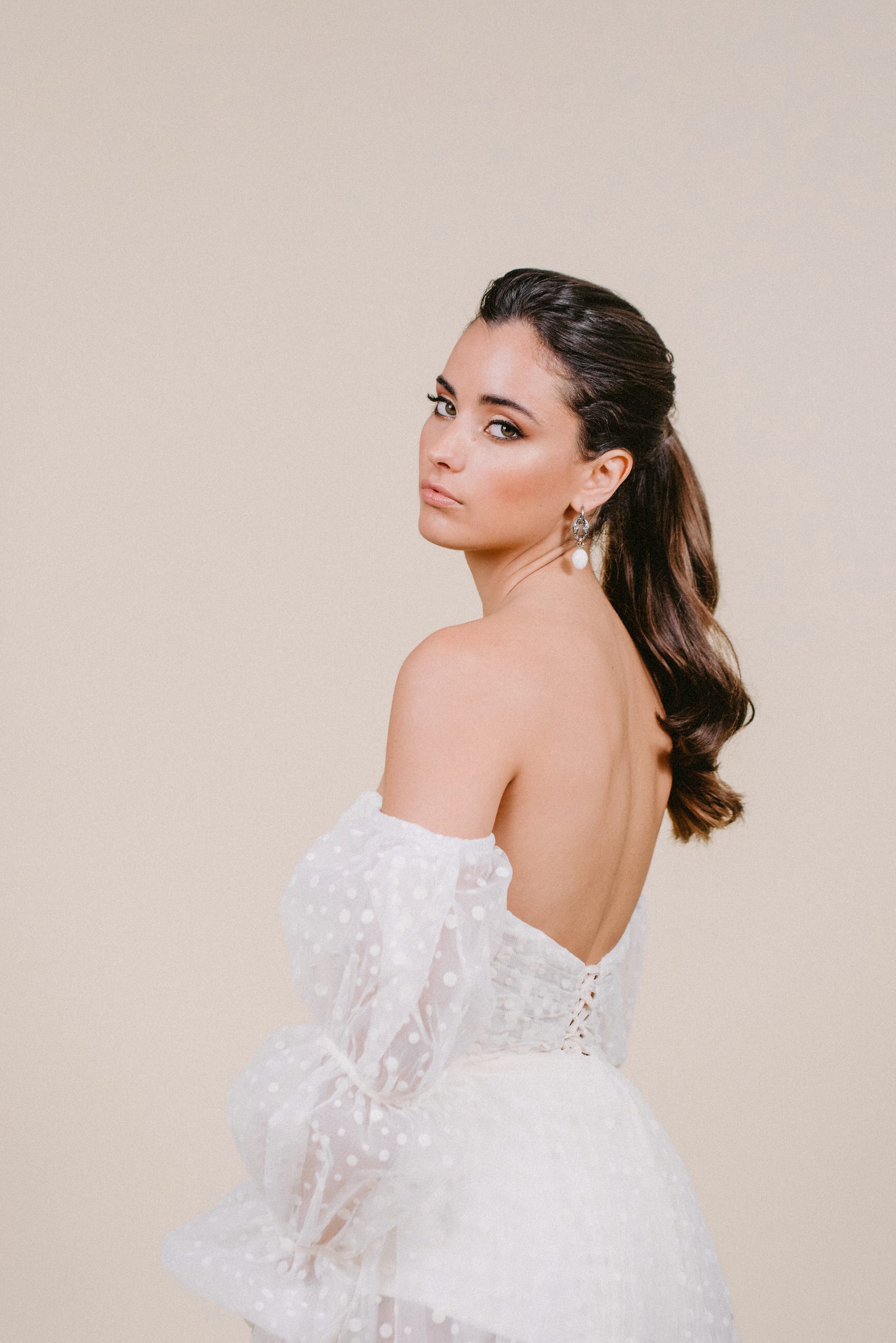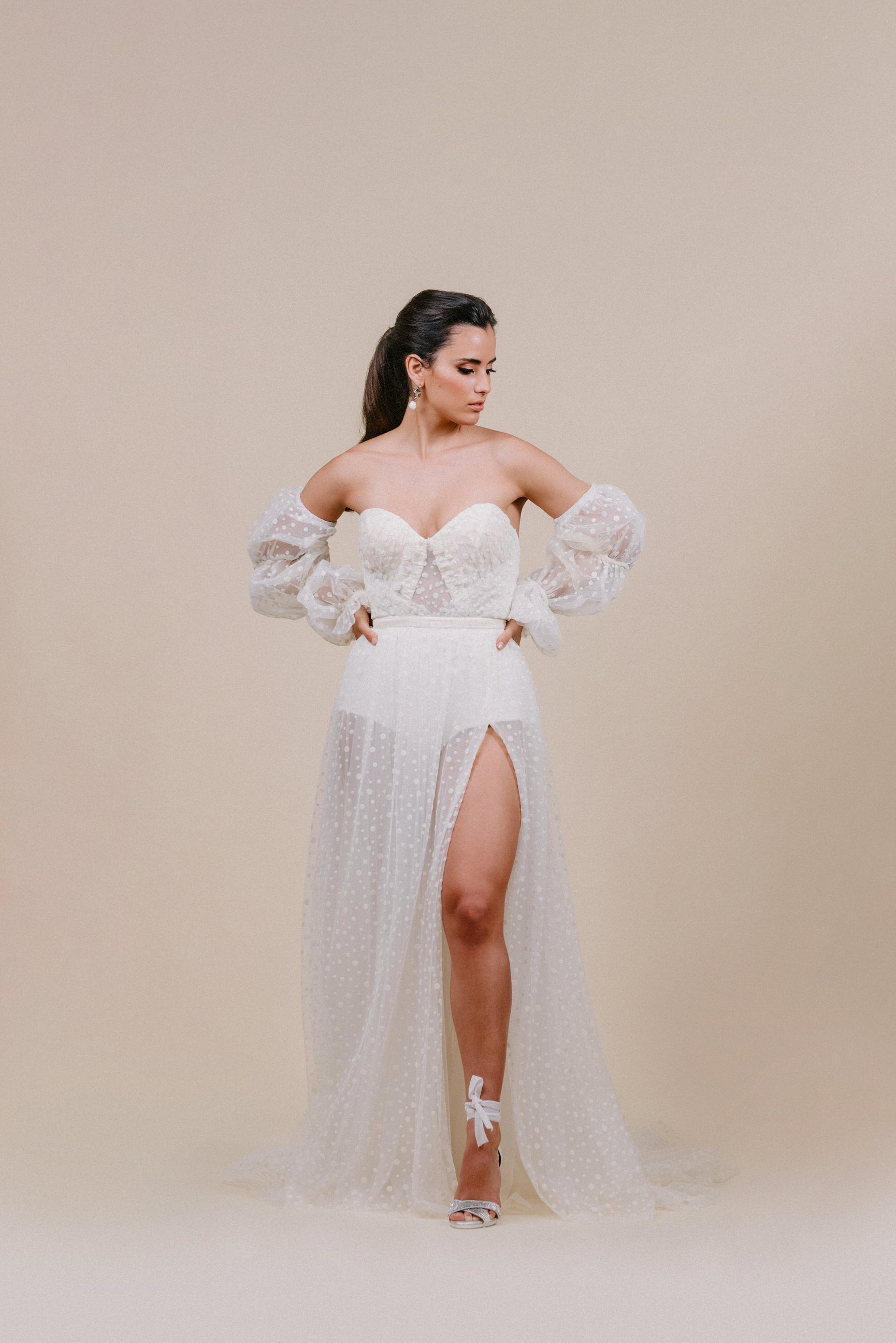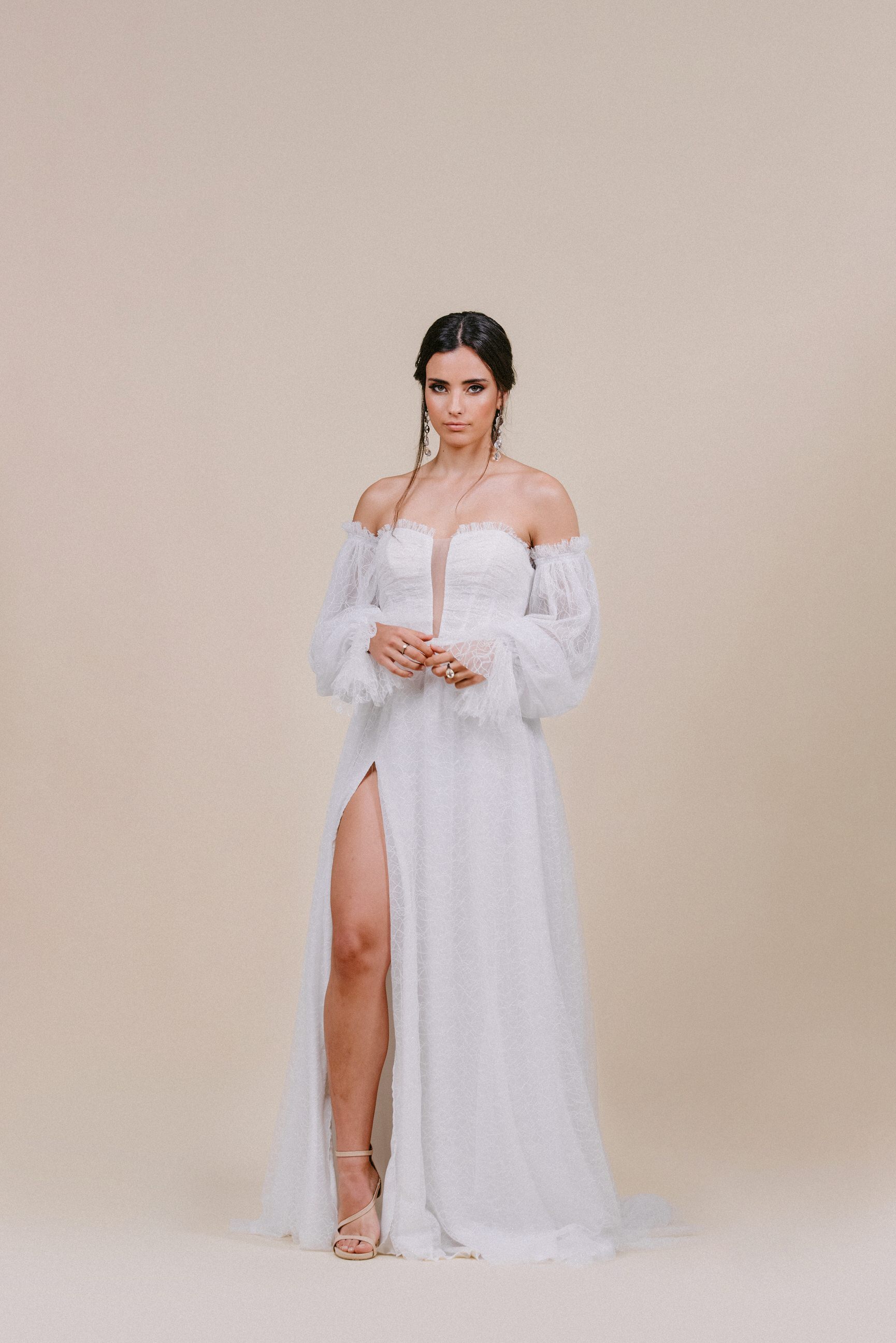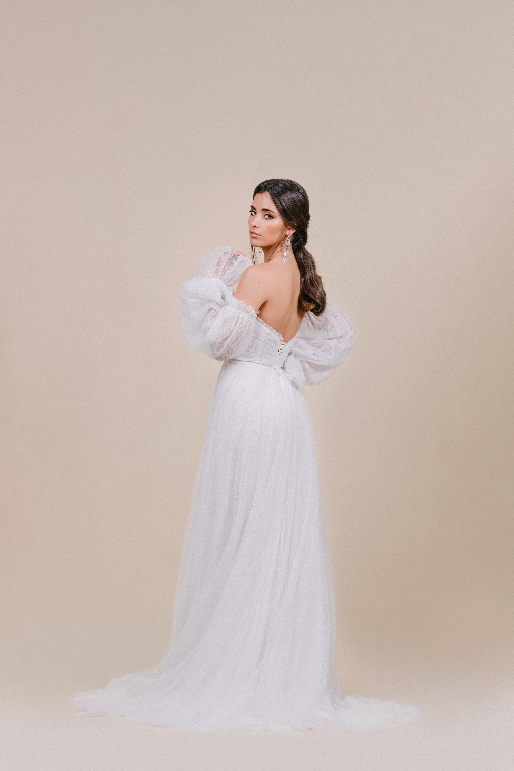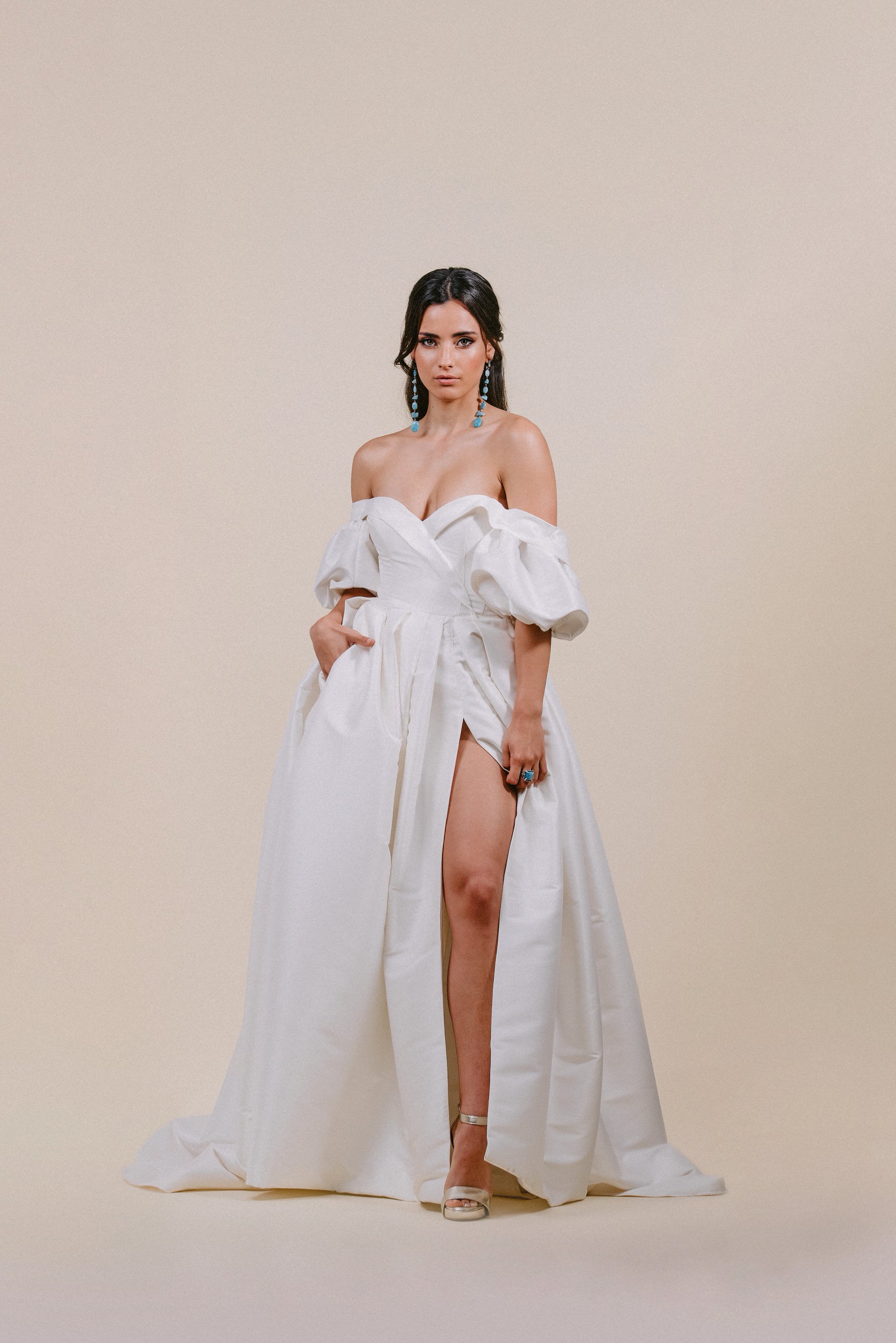Una colección de vestidos de novia, urbana y sofisticada creada para fluir en cada movimiento, sin limitaciones. Las prendas confeccionadas íntegramente en nuestro atelier de Elche con métodos artesanales, incluyen tejidos ligeros, mangas abullonadas de quita y pon, semi transparencias y siluetas vaporosas.
