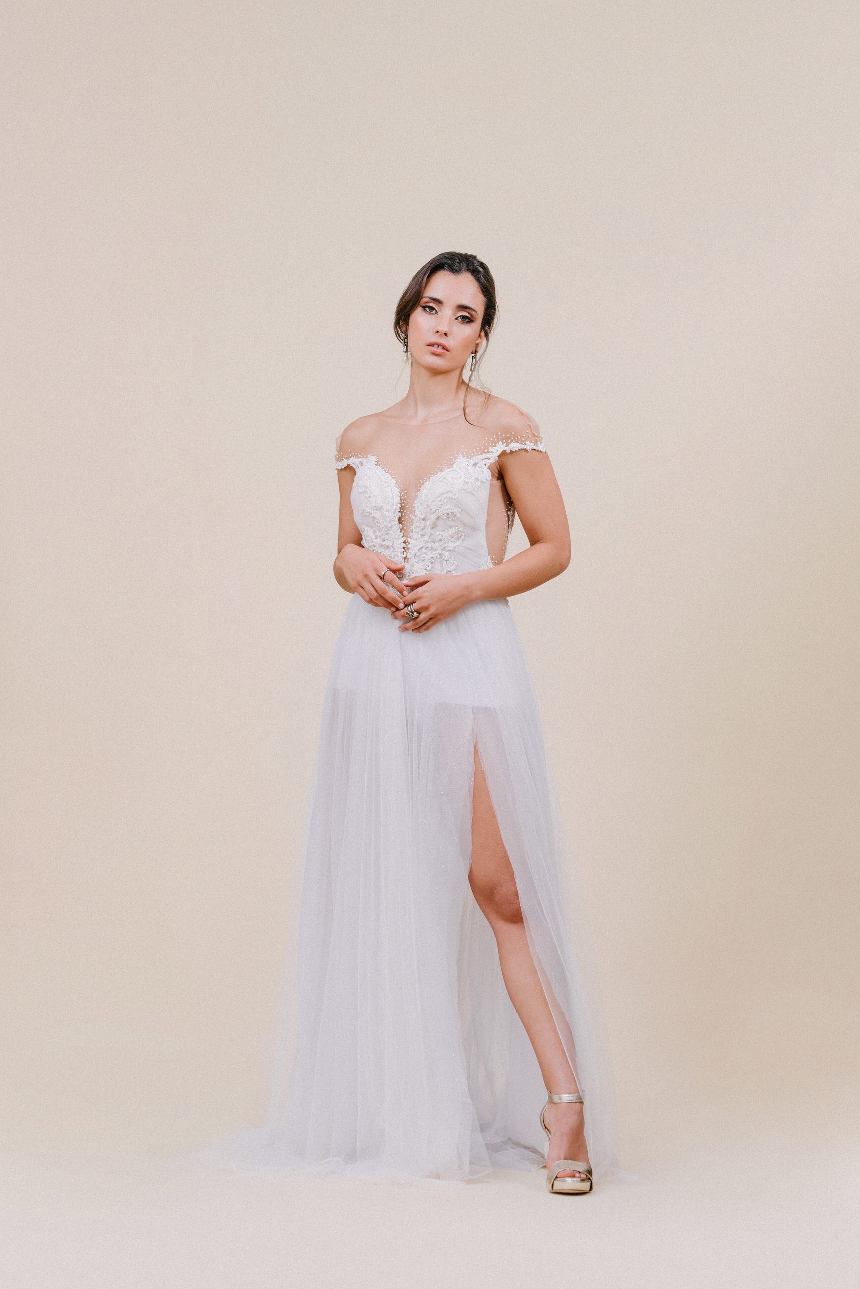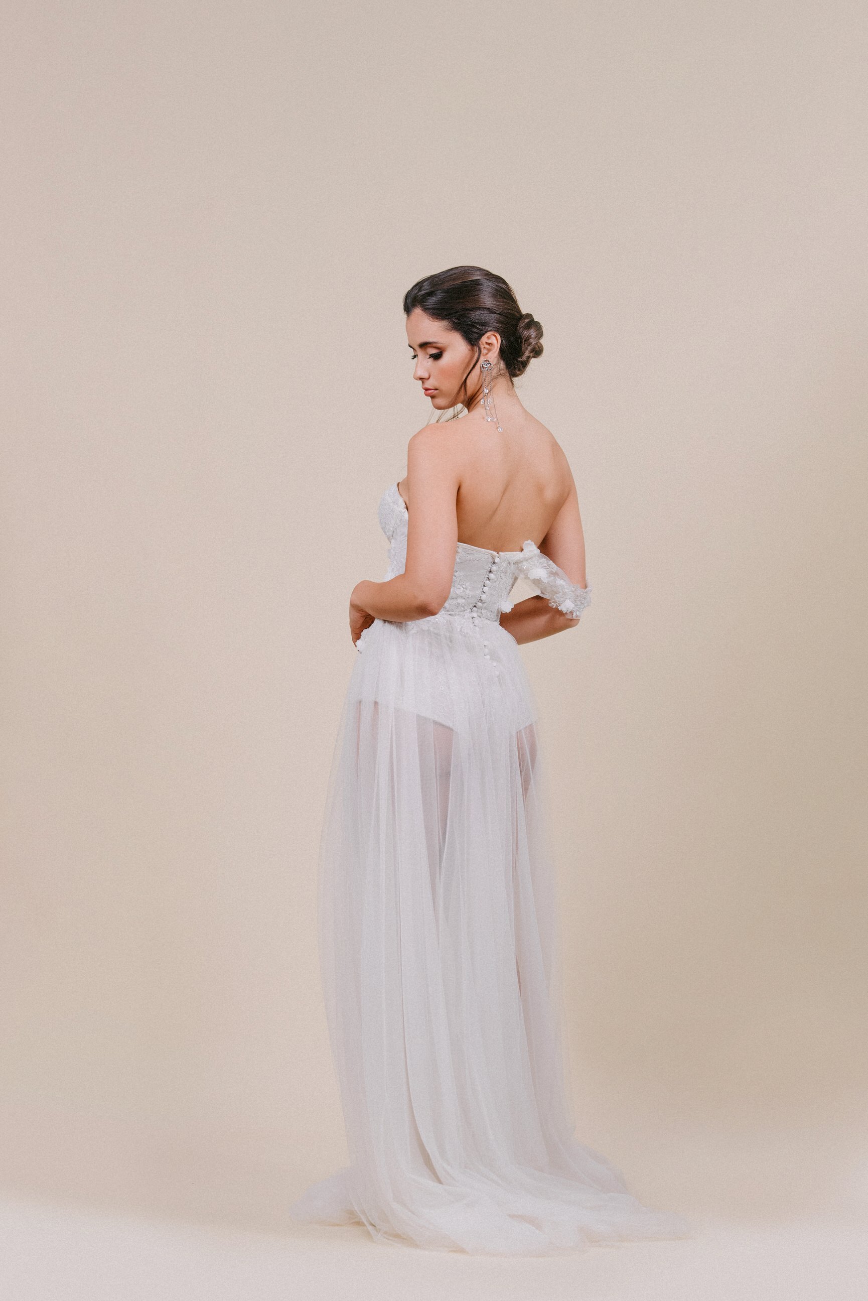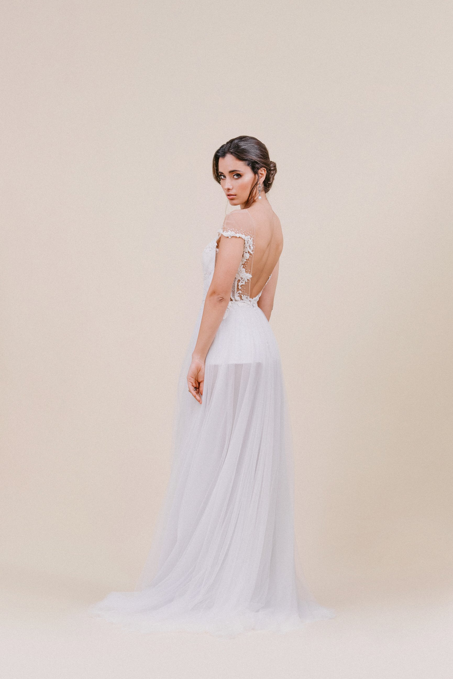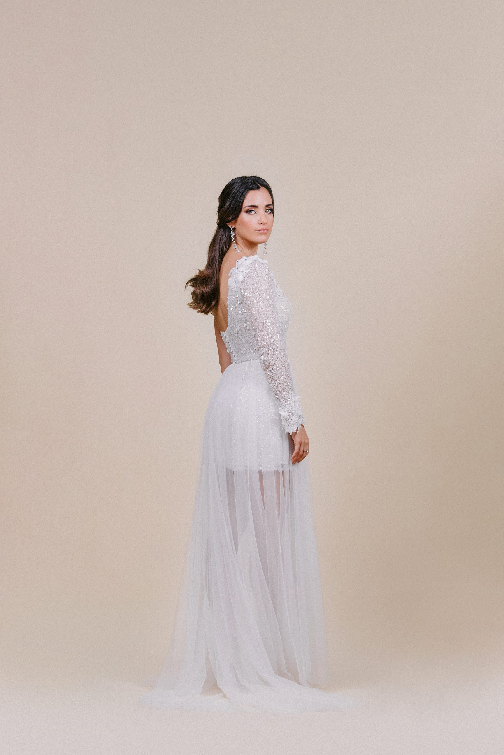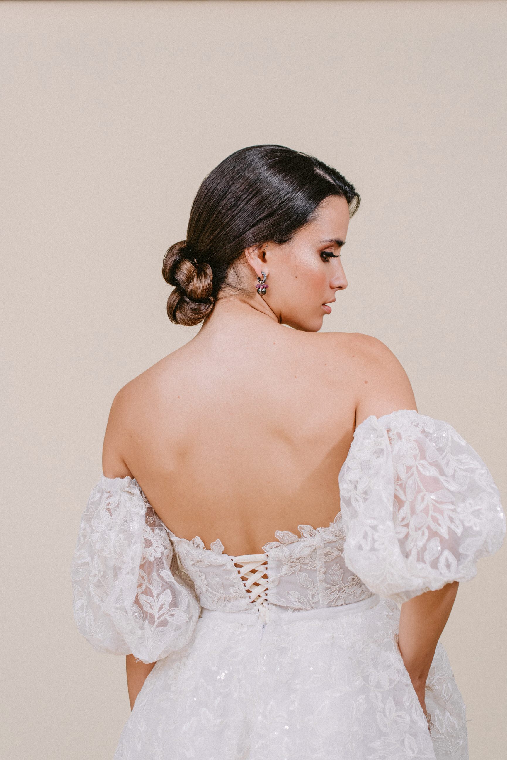 Una colección de vestidos de novia, urbana y sofisticada creada para fluir en cada movimiento, sin limitaciones. Las prendas confeccionadas íntegramente en nuestro atelier de Elche con métodos artesanales, incluyen tejidos ligeros, mangas abullonadas de quita y pon, semi transparencias y siluetas vaporosas.