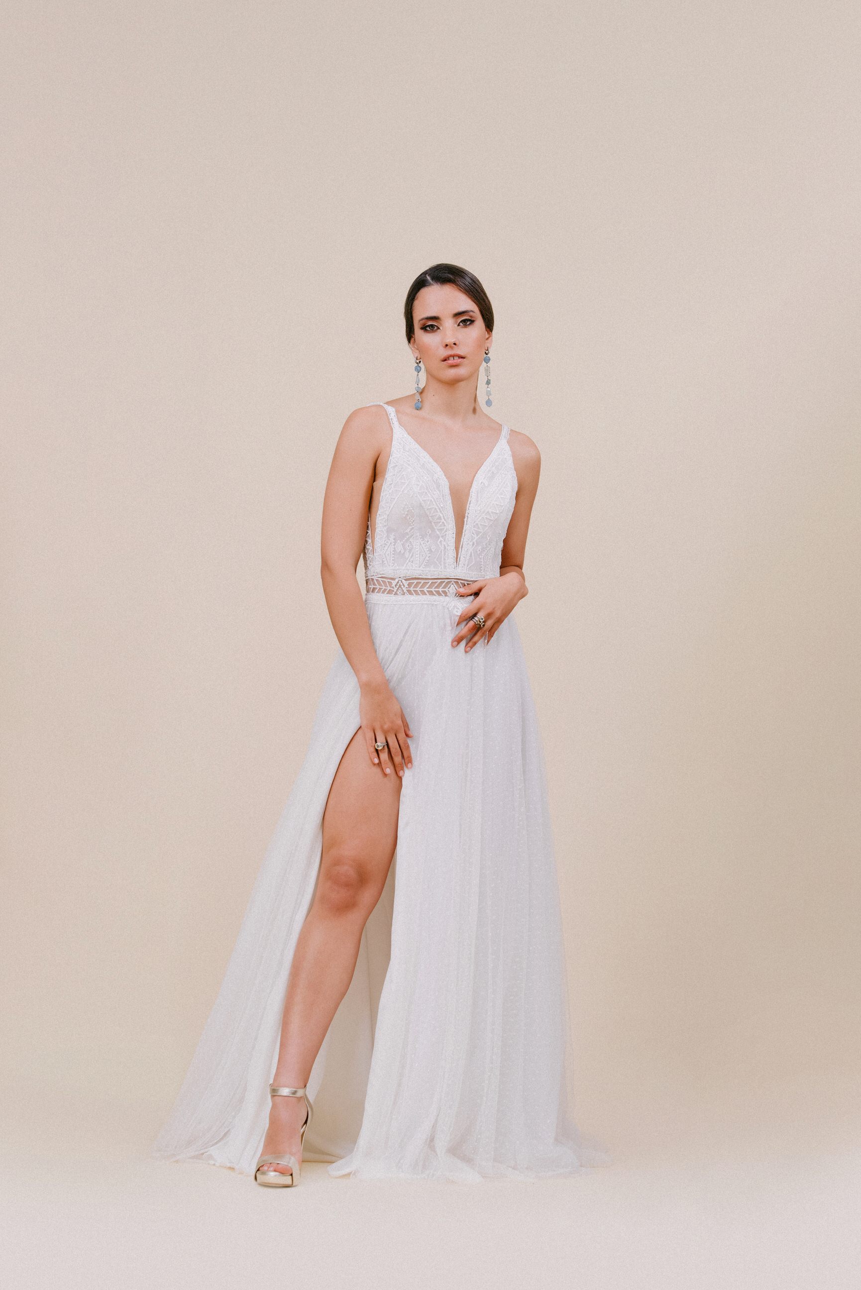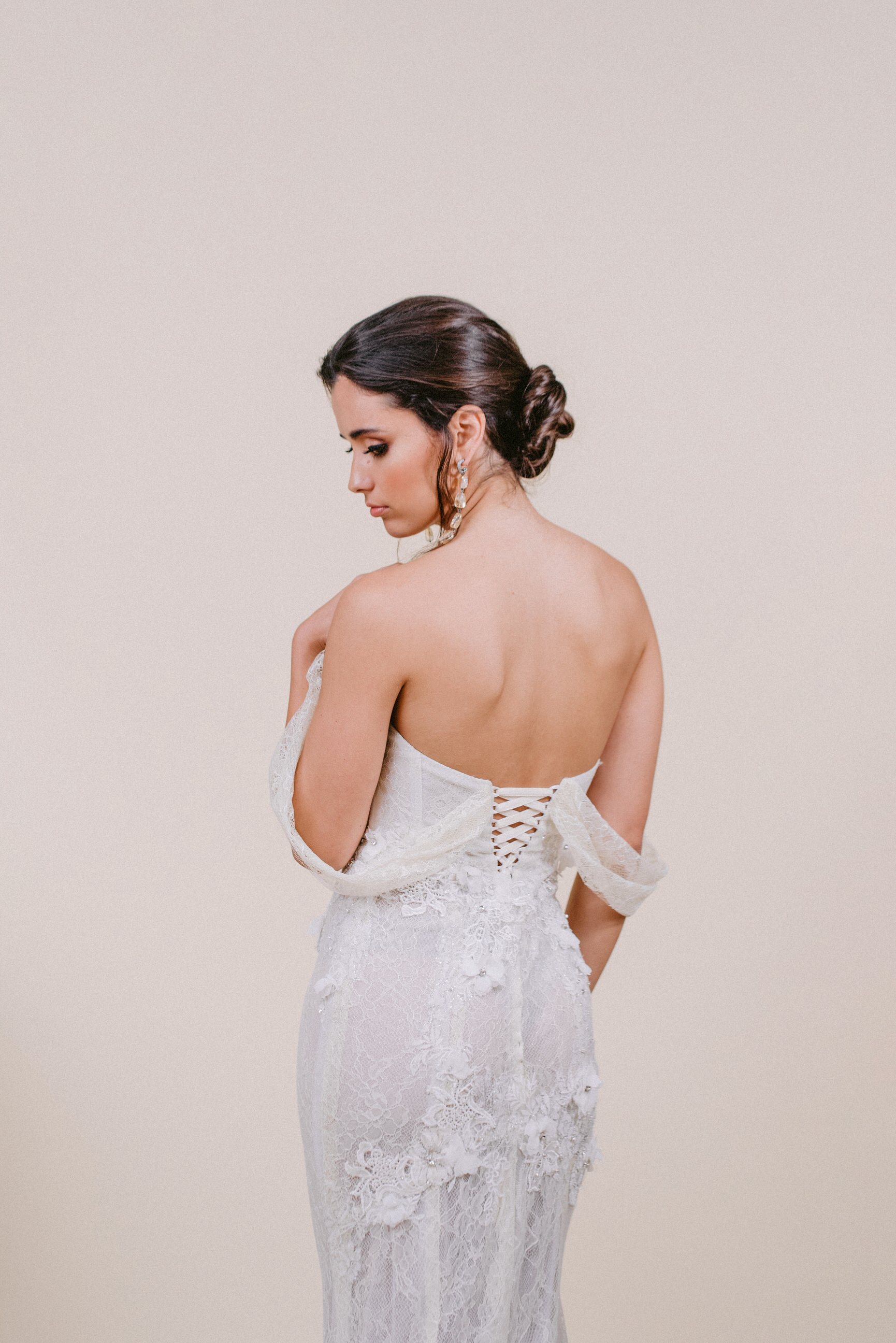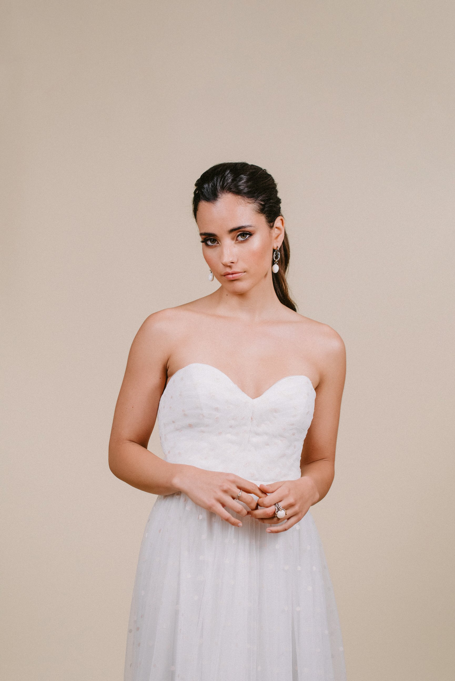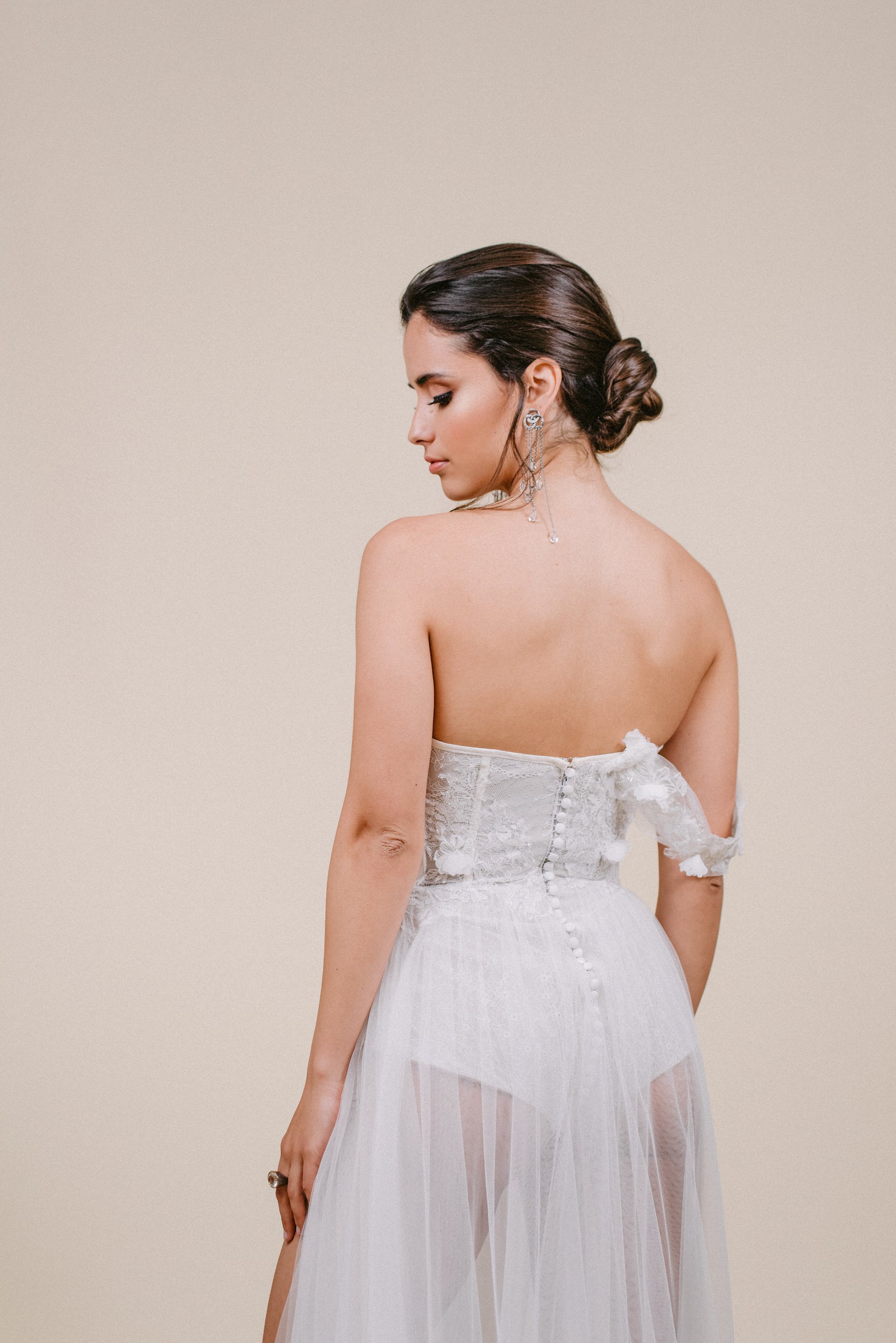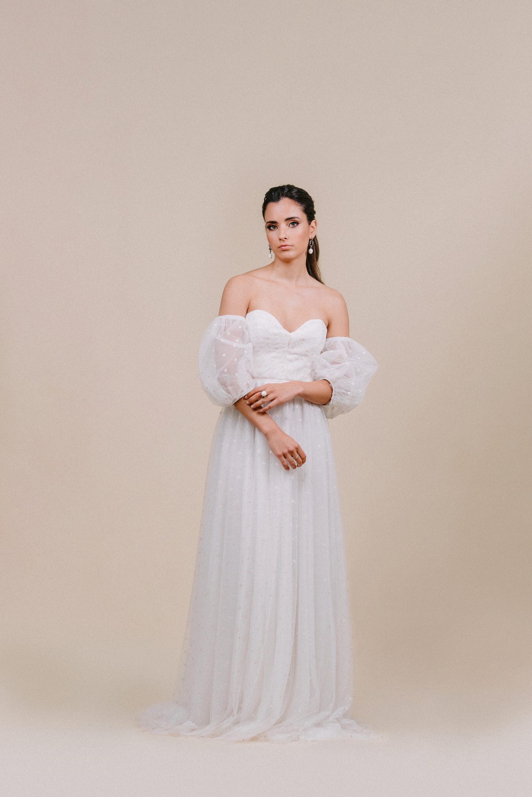 Una colección de vestidos de novia, urbana y sofisticada creada para fluir en cada movimiento, sin limitaciones. Las prendas confeccionadas íntegramente en nuestro atelier de Elche con métodos artesanales, incluyen tejidos ligeros, mangas abullonadas de quita y pon, semi transparencias y siluetas vaporosas.