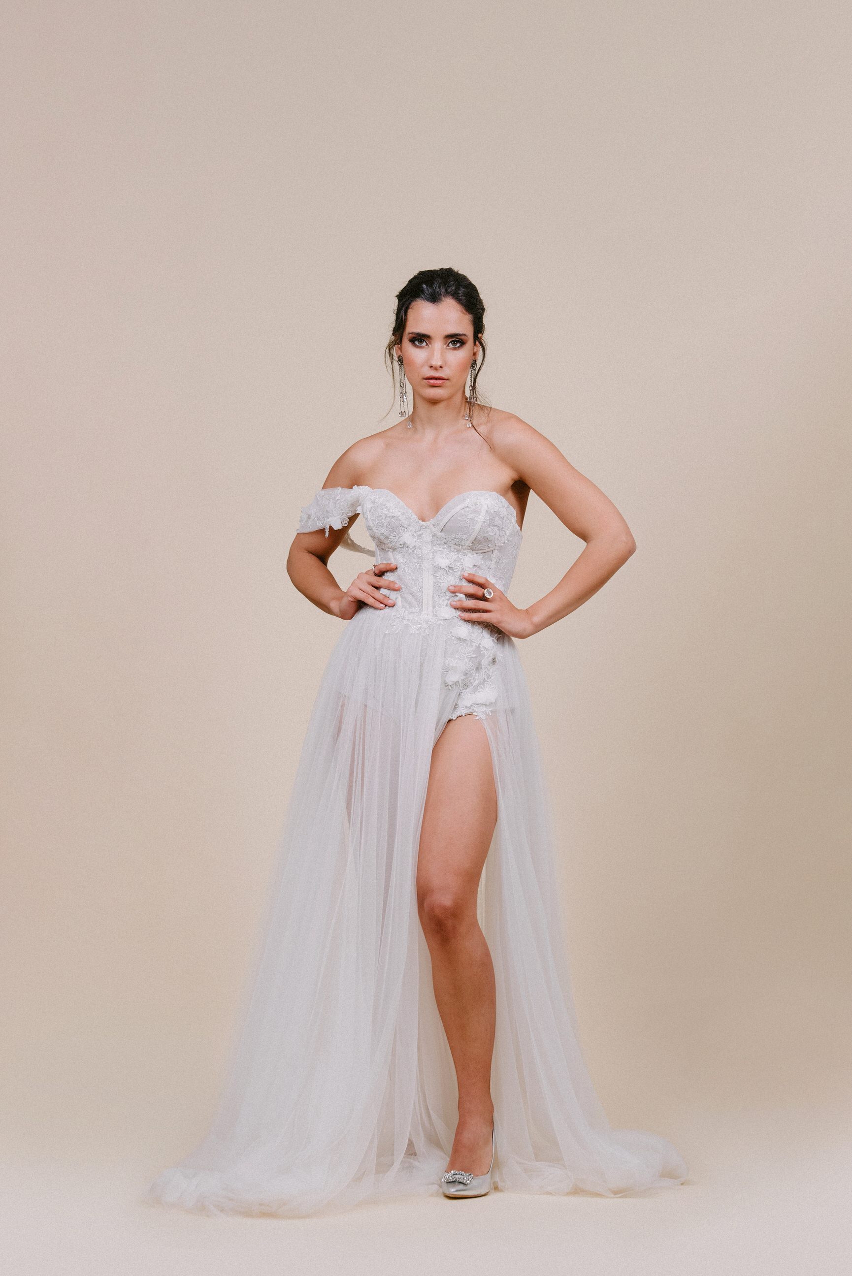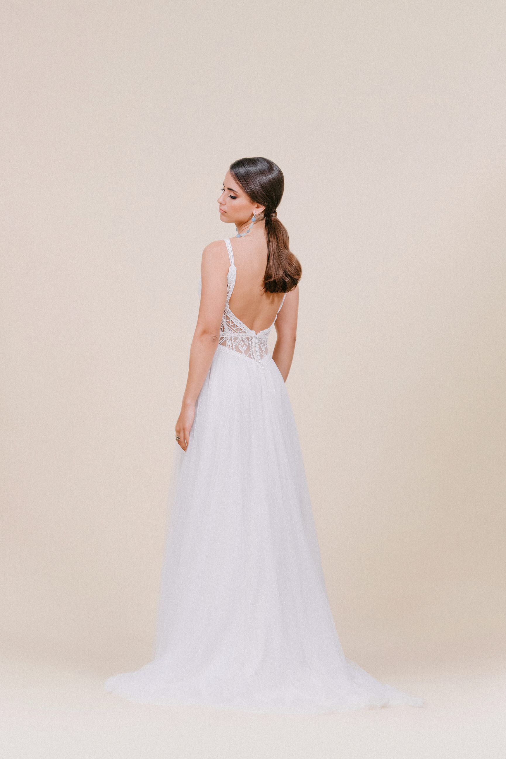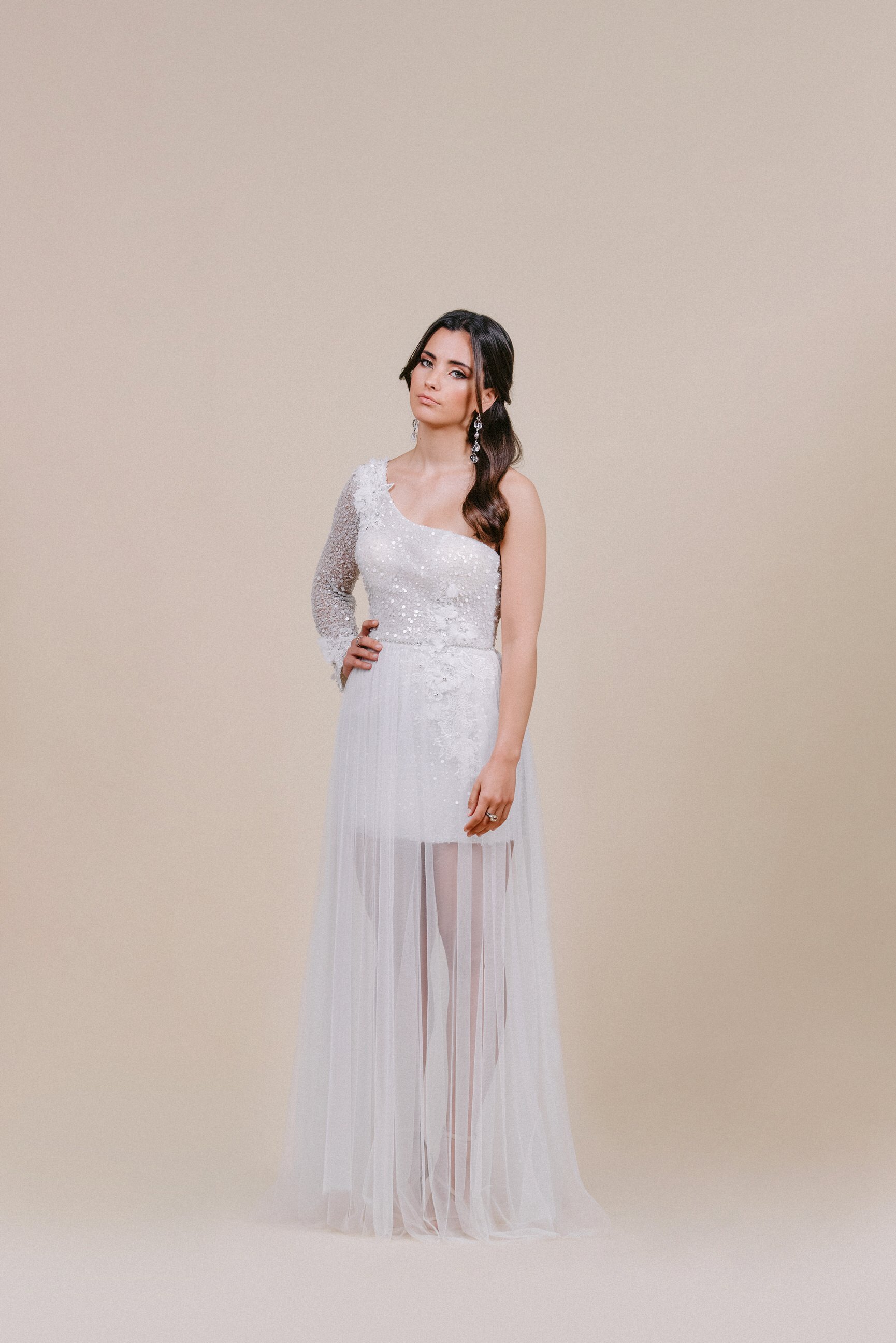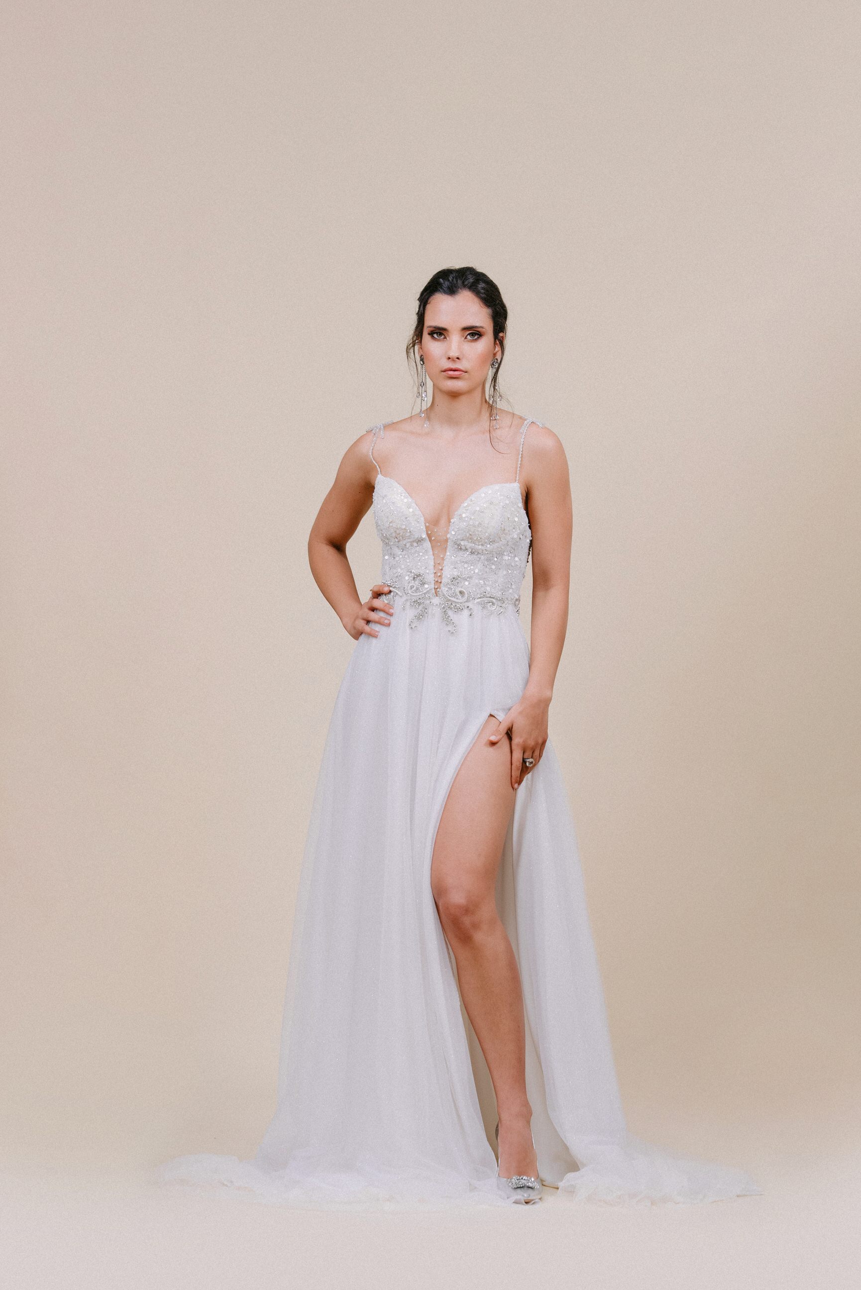 Una colección de vestidos de novia, urbana y sofisticada creada para fluir en cada movimiento, sin limitaciones. Las prendas confeccionadas íntegramente en nuestro atelier de Elche con métodos artesanales, incluyen tejidos ligeros, mangas abullonadas de quita y pon, semi transparencias y siluetas vaporosas.