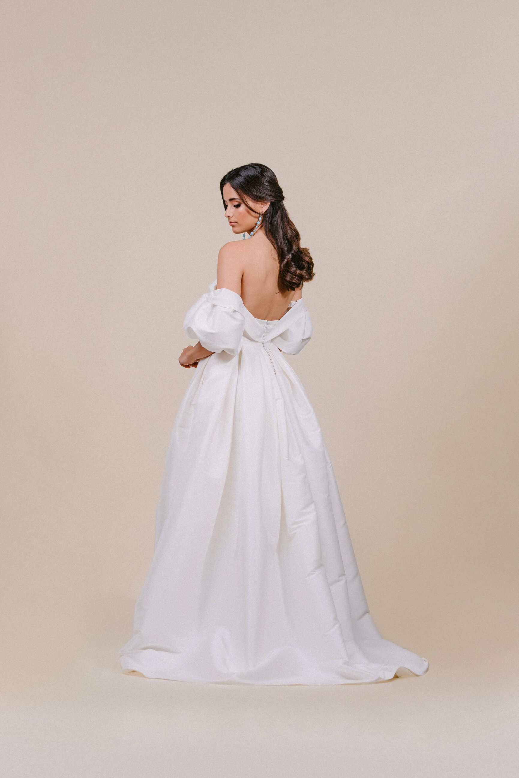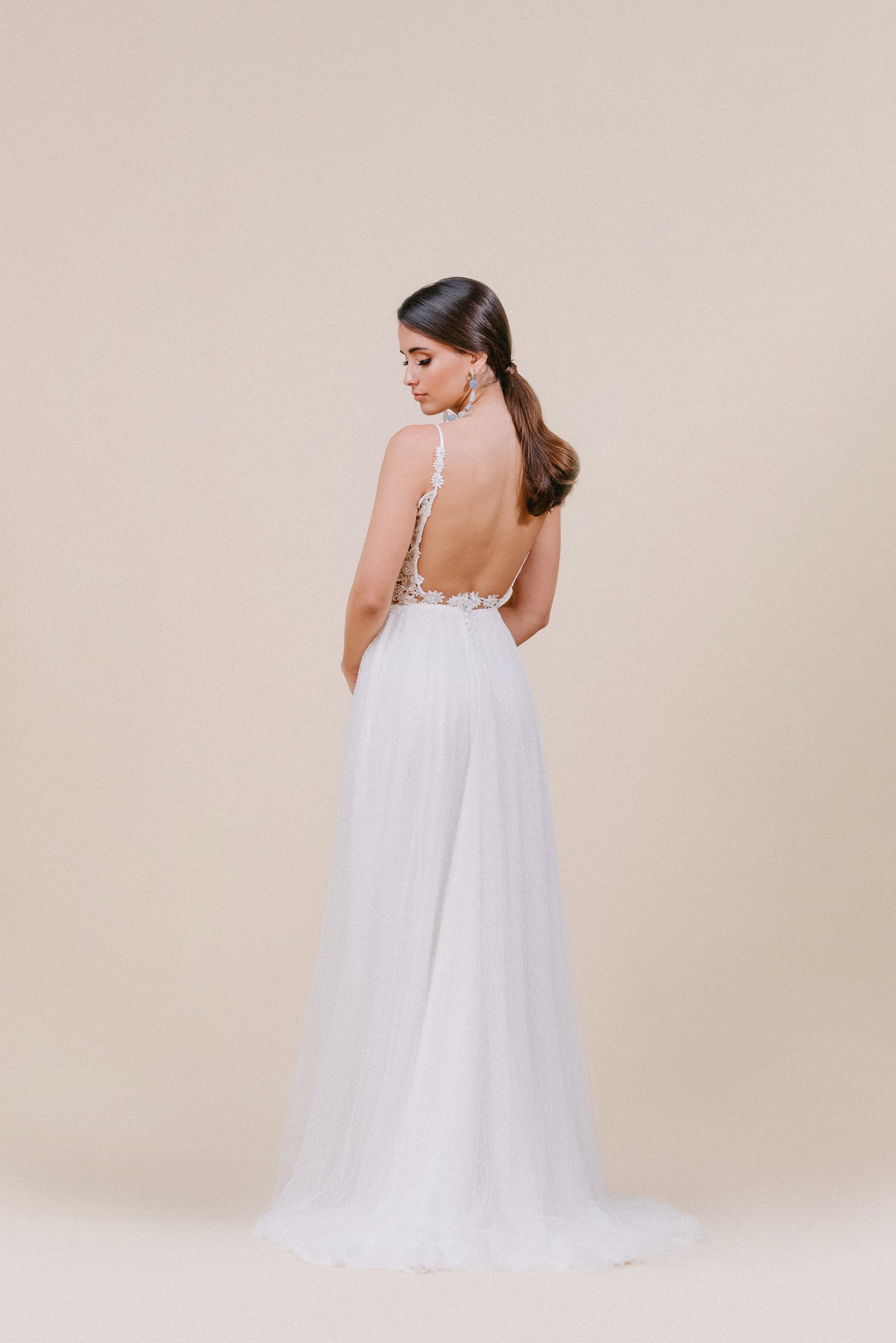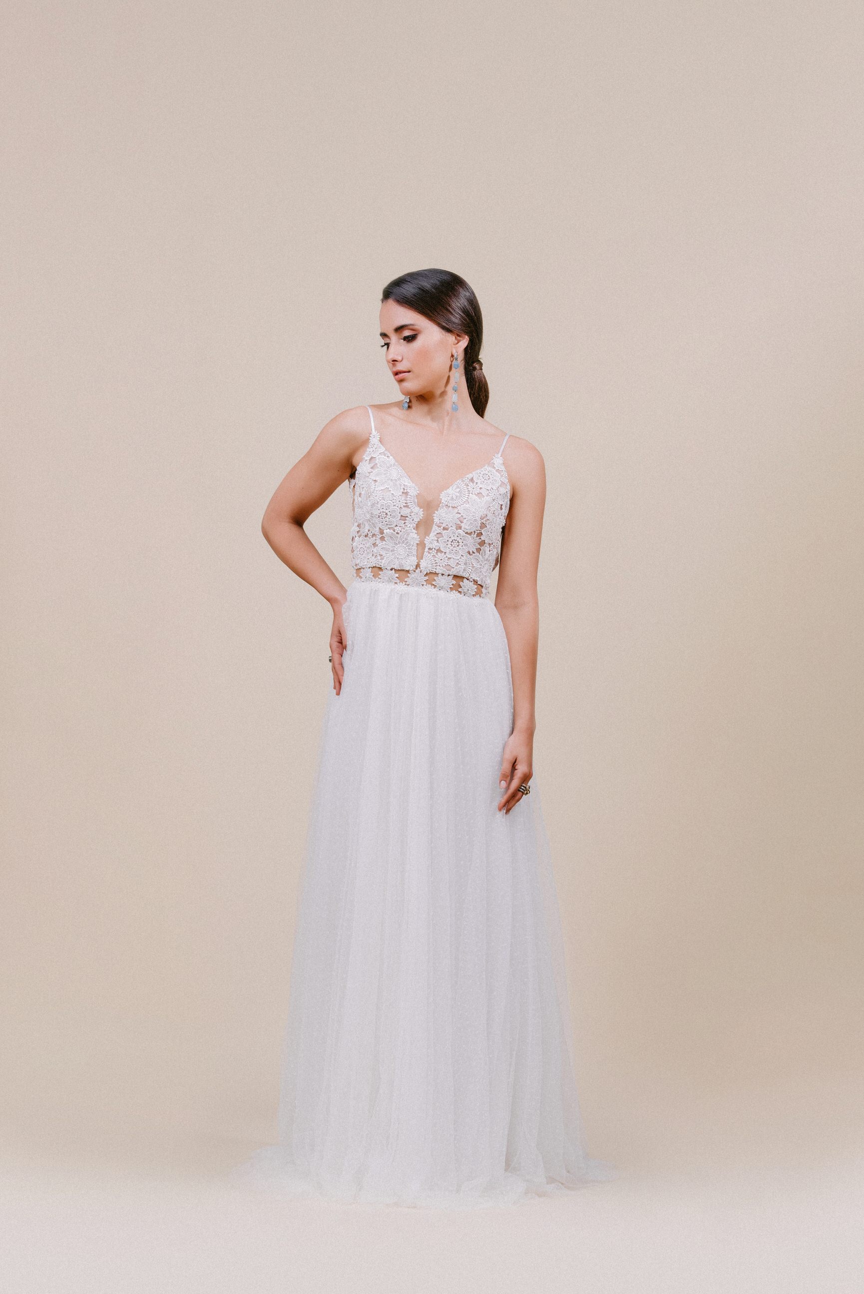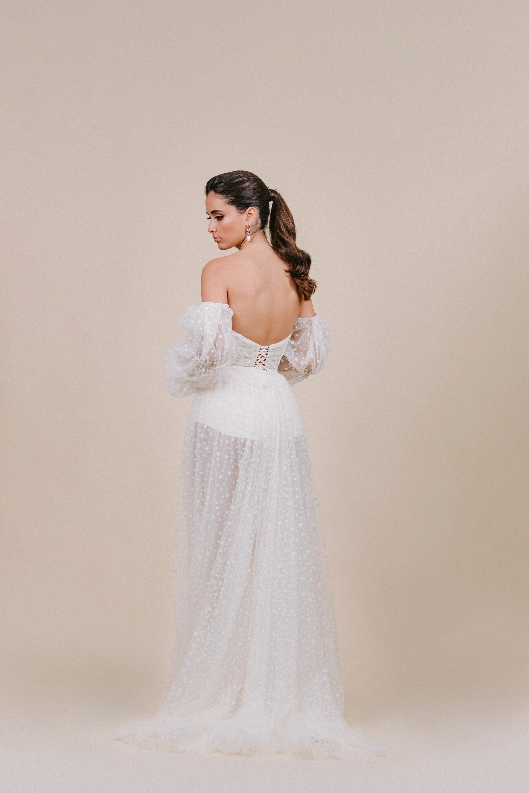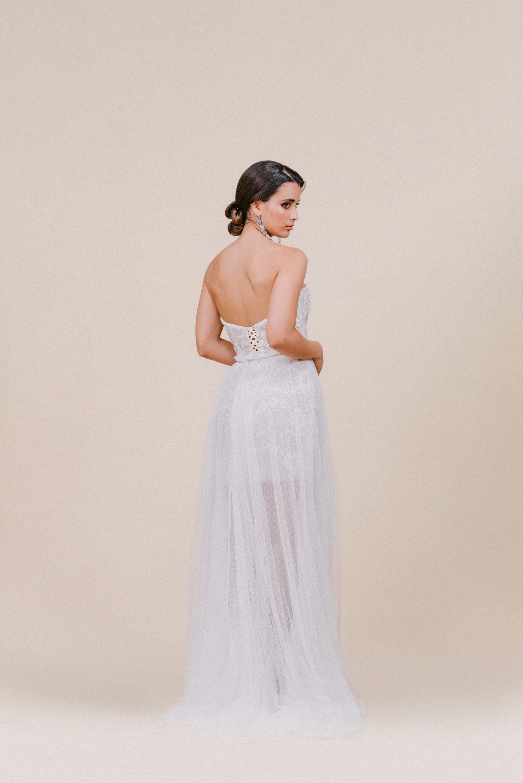 Una colección de vestidos de novia, urbana y sofisticada creada para fluir en cada movimiento, sin limitaciones. Las prendas confeccionadas íntegramente en nuestro atelier de Elche con métodos artesanales, incluyen tejidos ligeros, mangas abullonadas de quita y pon, semi transparencias y siluetas vaporosas.