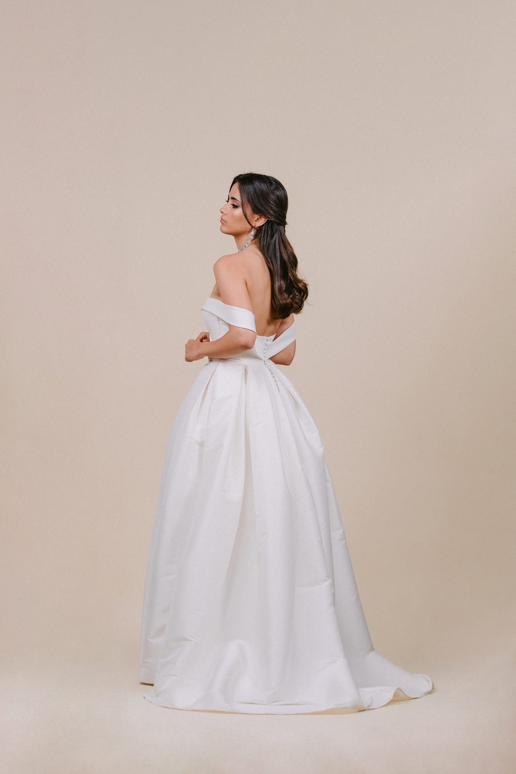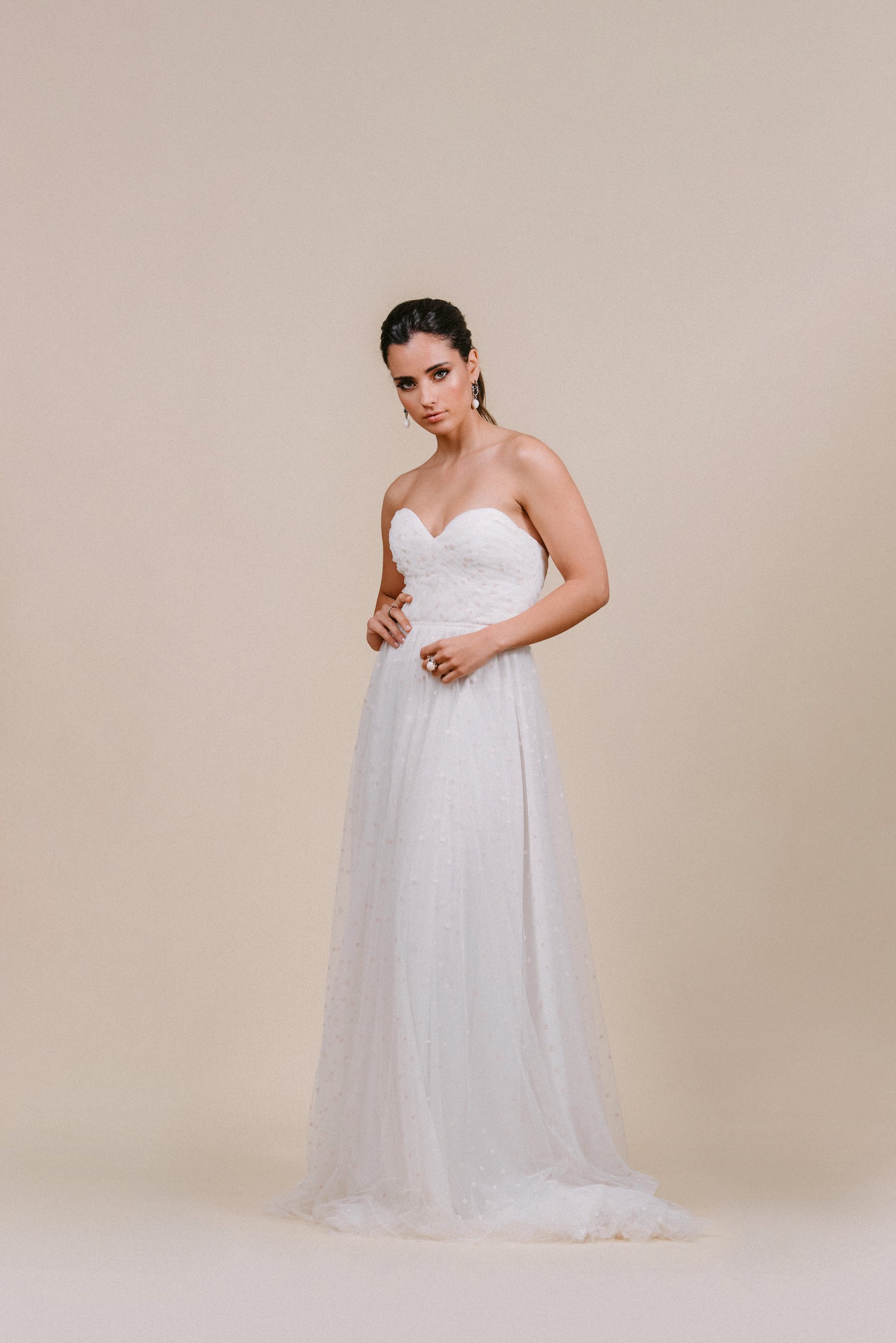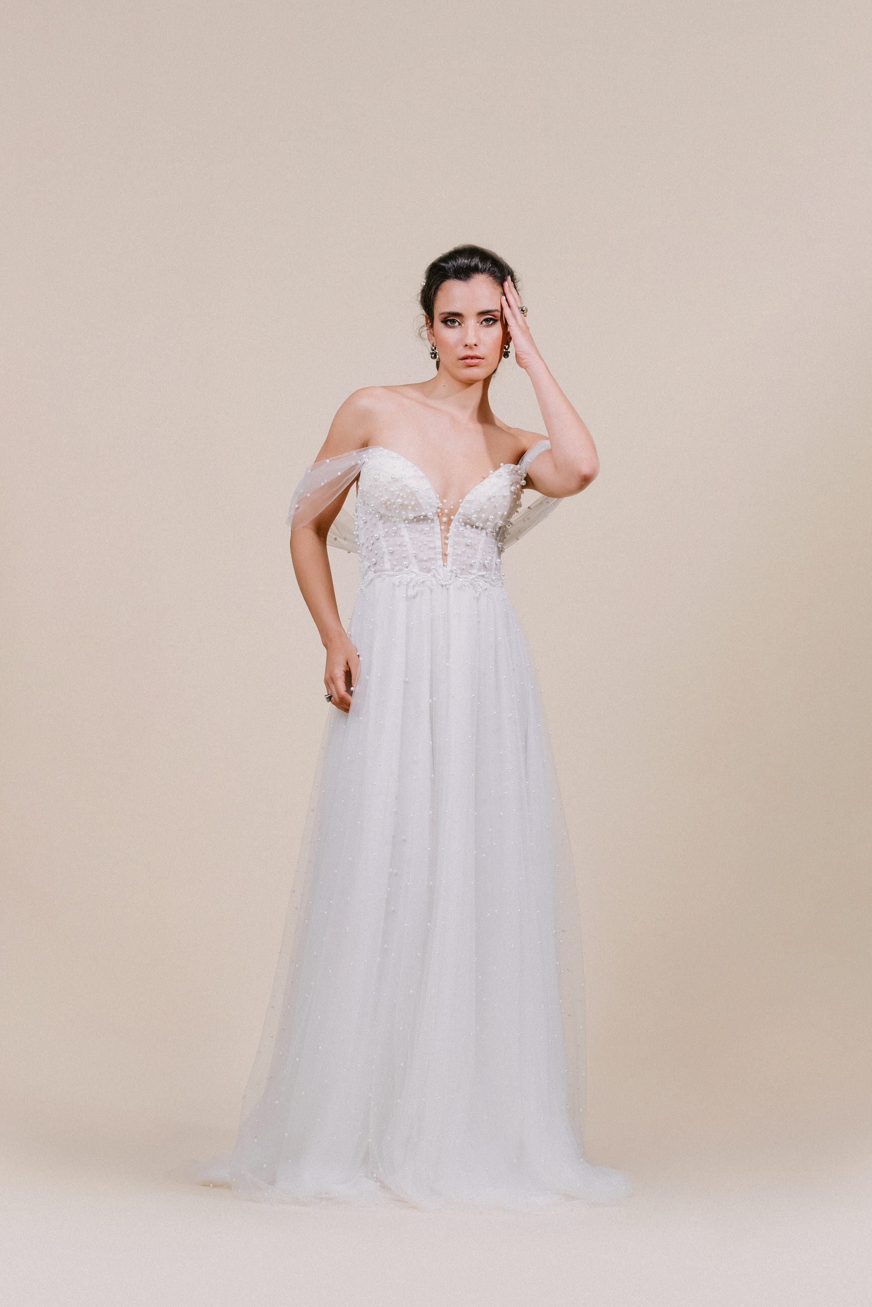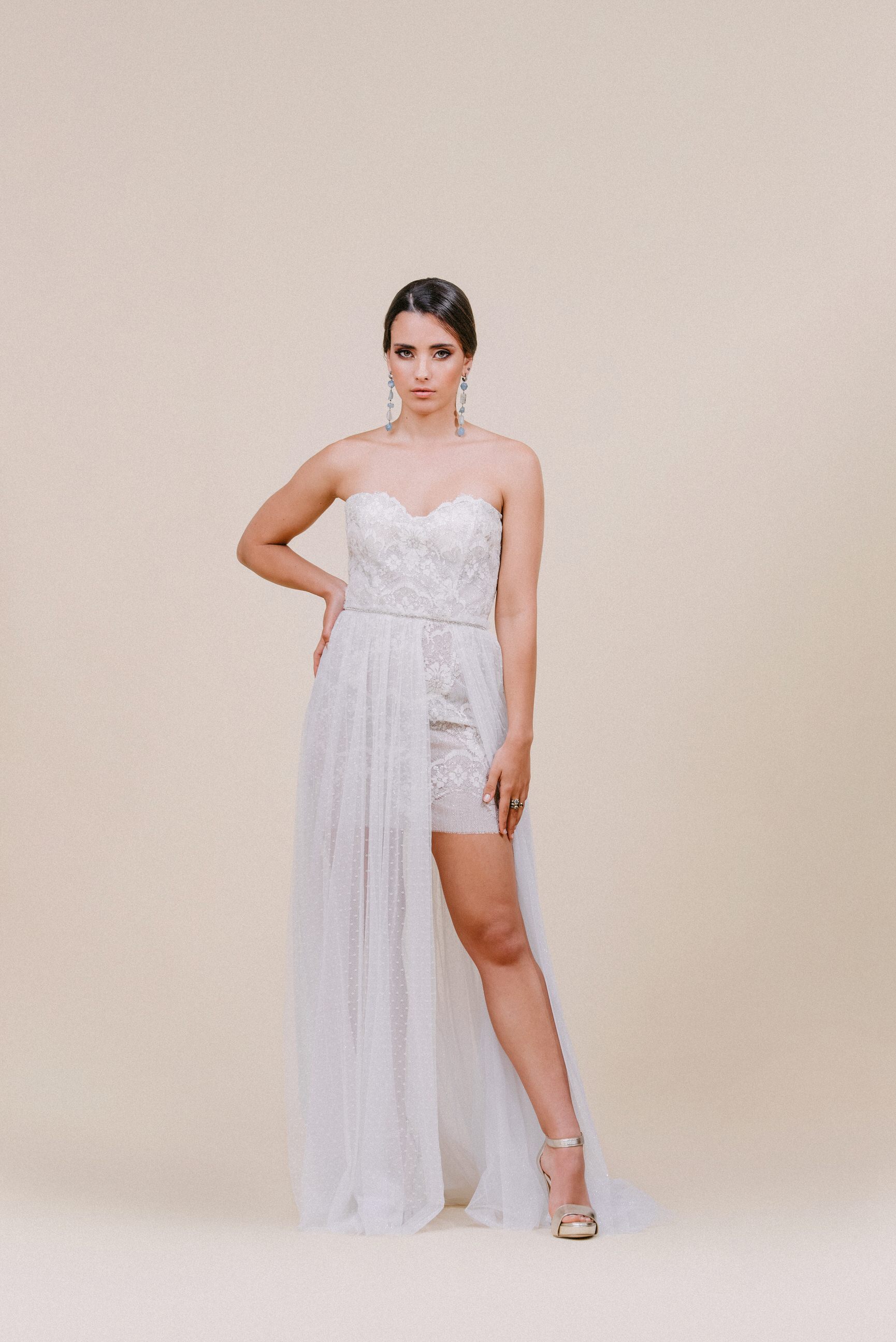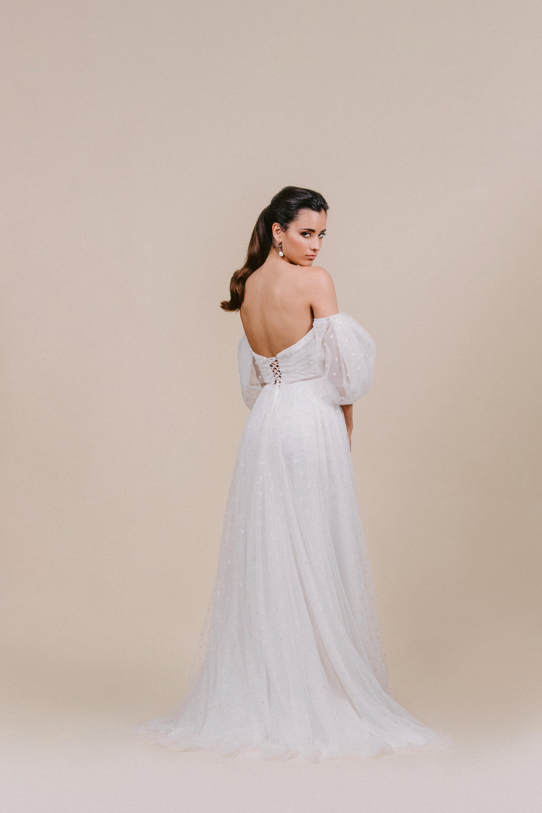 Una colección de vestidos de novia, urbana y sofisticada creada para fluir en cada movimiento, sin limitaciones. Las prendas confeccionadas íntegramente en nuestro atelier de Elche con métodos artesanales, incluyen tejidos ligeros, mangas abullonadas de quita y pon, semi transparencias y siluetas vaporosas.