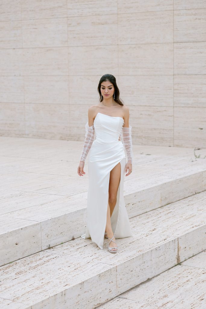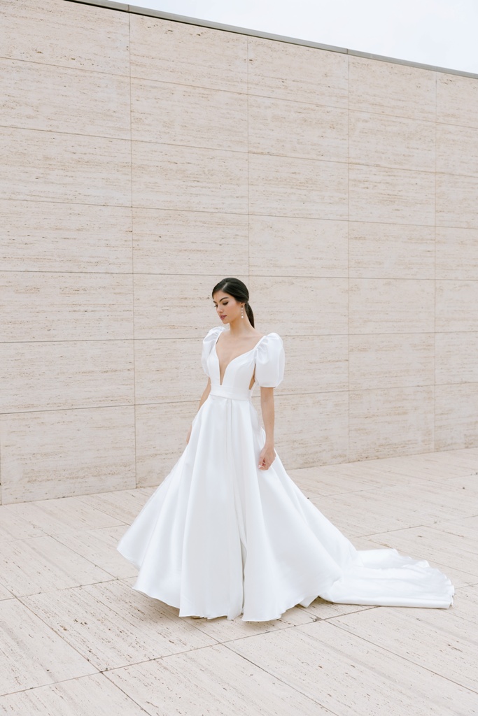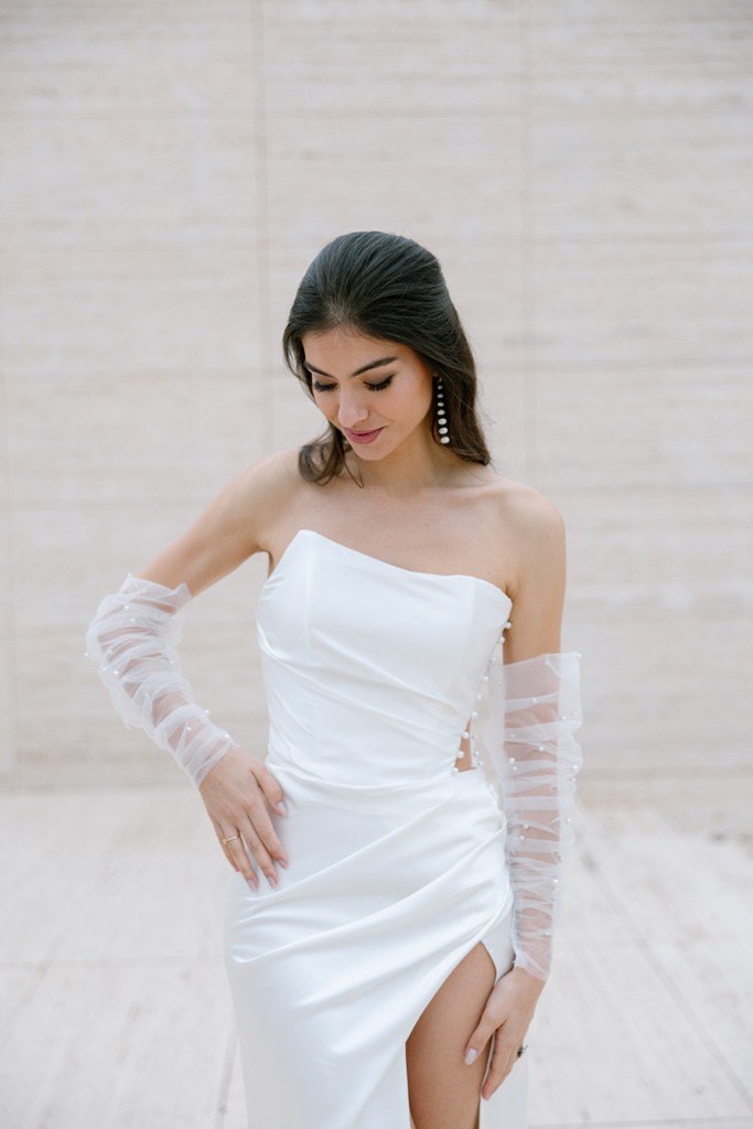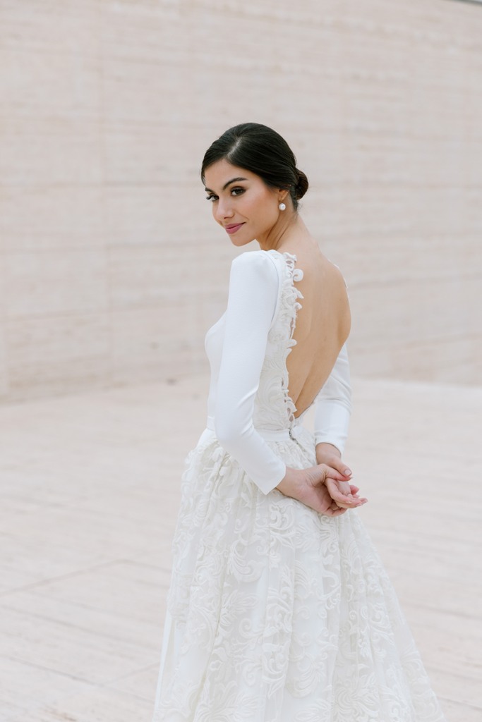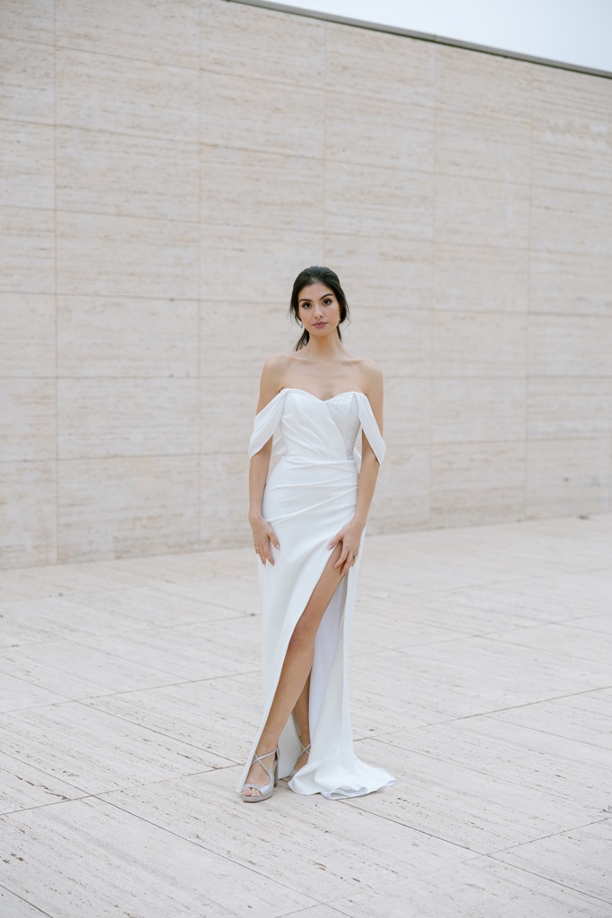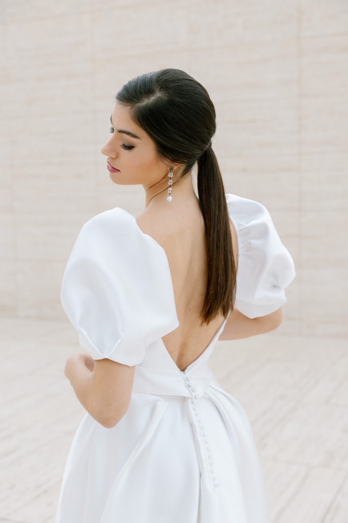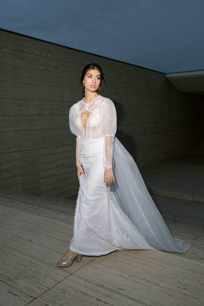 Siza es una colección de vestidos de novia versátiles en el que el mismo vestido se transforma para conseguir que luzca totalmente diferente gracias a mangas desmontables, sobrefaldas, capas y abrigos de organza.